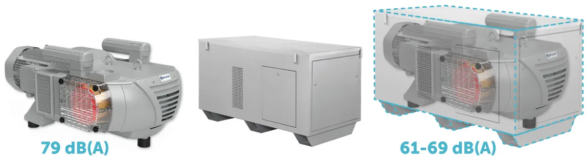 Como ejemplo, podemos ver cómo el equipo VTLF 2.500, el cual emite en su funcionamiento a 50 Hz sin cabina 79 dB(A), con cabina pasa a emitir 61-69 dB(A). Un descenso de entre 10 y 18 dB, es decir, pasar de no poder sostener una conversación con el equipo en marcha a tener que tocar la cabina para percibir el funcionamiento de la bomba.